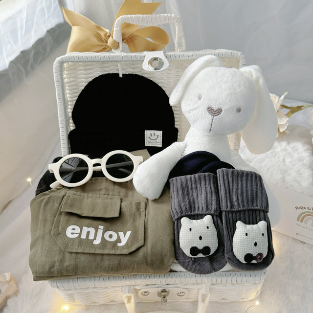 The Mini Militia Green Giftbox is perfect for little adventurers! Featuring a sleek black romper with an adventure-green outerwear and matching hat, this set is designed for parents who love a bold, outdoorsy vibe. Whether for a baby shower, birthday, or milestone celebration, this giftbox brings a touch of adventure to every occasion.